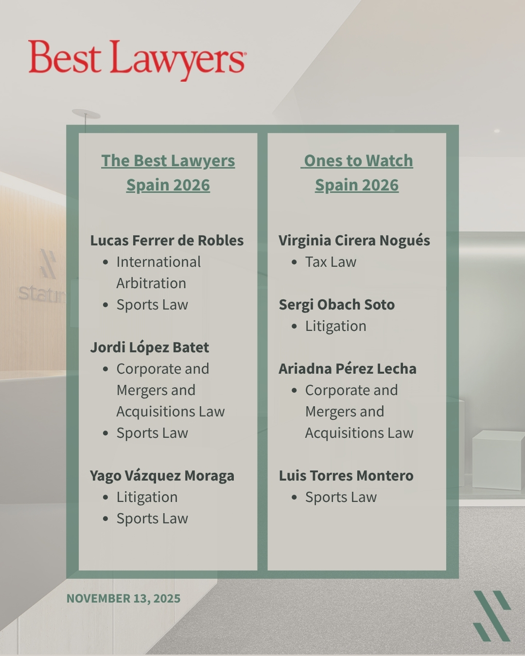 The Best Lawyers 2026 legal directory has selected once again our partners Yago Vázquez Moraga, Jordi López, and Lucas Ferrer as leading lawyers. As in previous editions, the directory highlights Yago Vázquez in Litigation and Sports Law; Jordi López in Commercial Law, Mergers and Acquisitions, and Sports Law; and Lucas Ferrer in Sports Law and International Arbitration. The directory also highlights four Statim associates as Ones to Watch: Virginia Cirera Nogués (Tax Law), Luis Torres Montero (Sports Law), Sergi Obach Soto (Litigation), and Ariadna Perez Lecha (Corporate and Mergers and Acquisitions Law). Best Lawyers conducts the selection process through confidential recommendations from colleagues and firms, whom we thank once again for their trust in Statim.